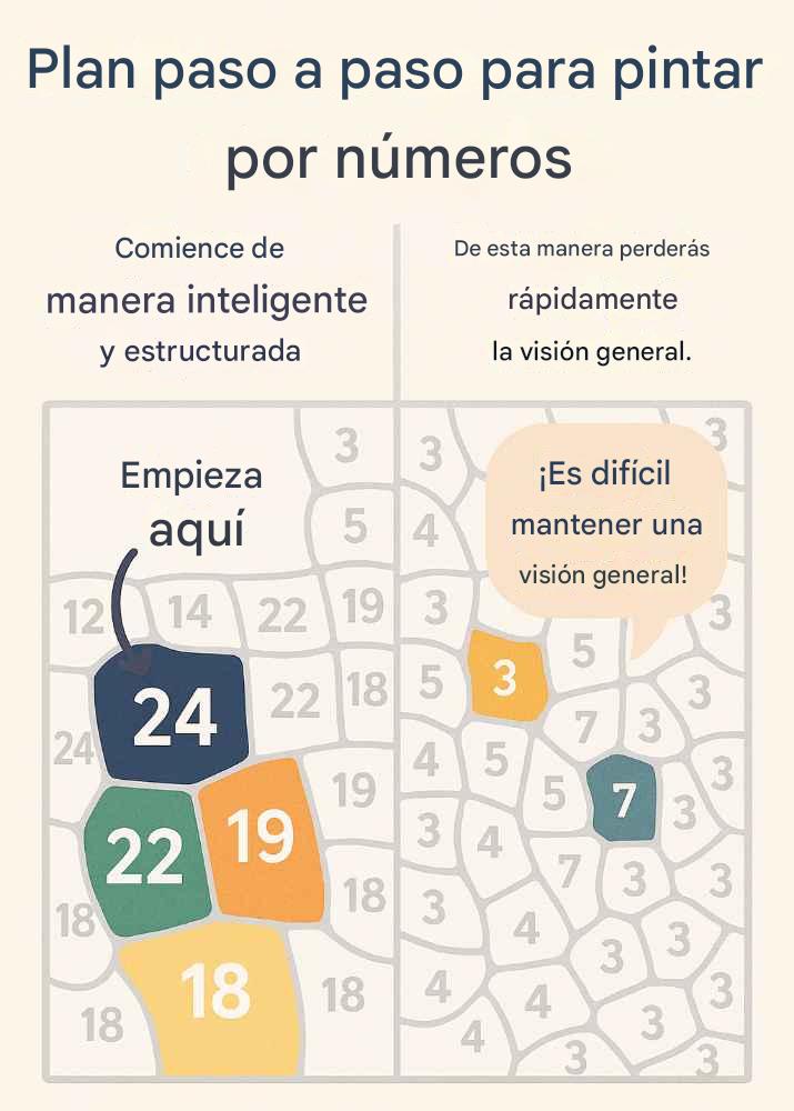 Este método evita que pases por alto áreas importantes de color y asegura que tu proyecto se vea bonito y estructurado rápidamente. ¿Quieres saber más sobre un enfoque inteligente para principiantes? Lee también pintar por números: la guía definitiva para principiantes.