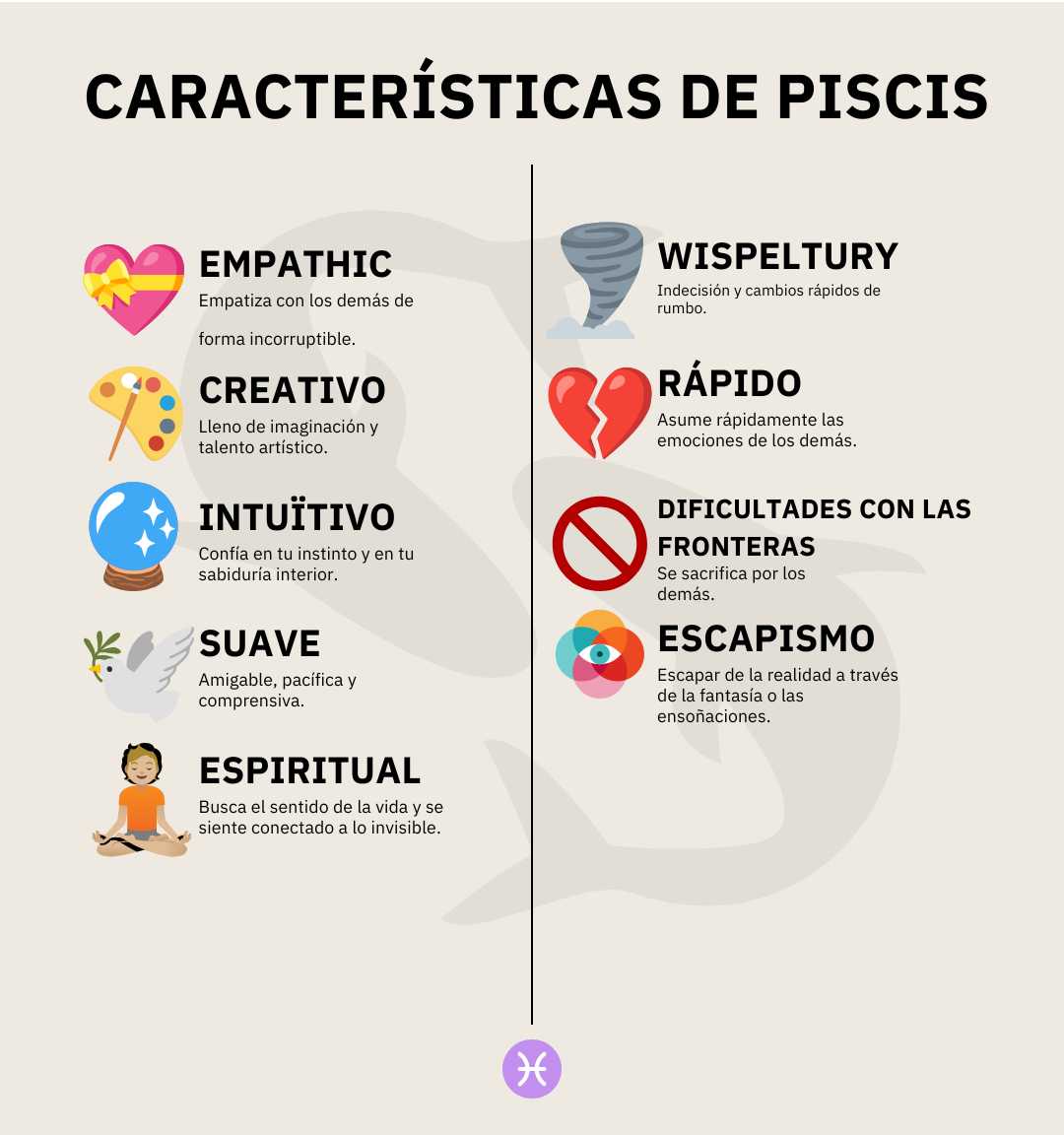 El signo zodiacal Piscis se conoce por cualidades como la empatía, la intuición, la creatividad, la sensibilidad y una rica imaginación. Piscis es atento y espiritual, pero también puede ser inconstante y vulnerable.