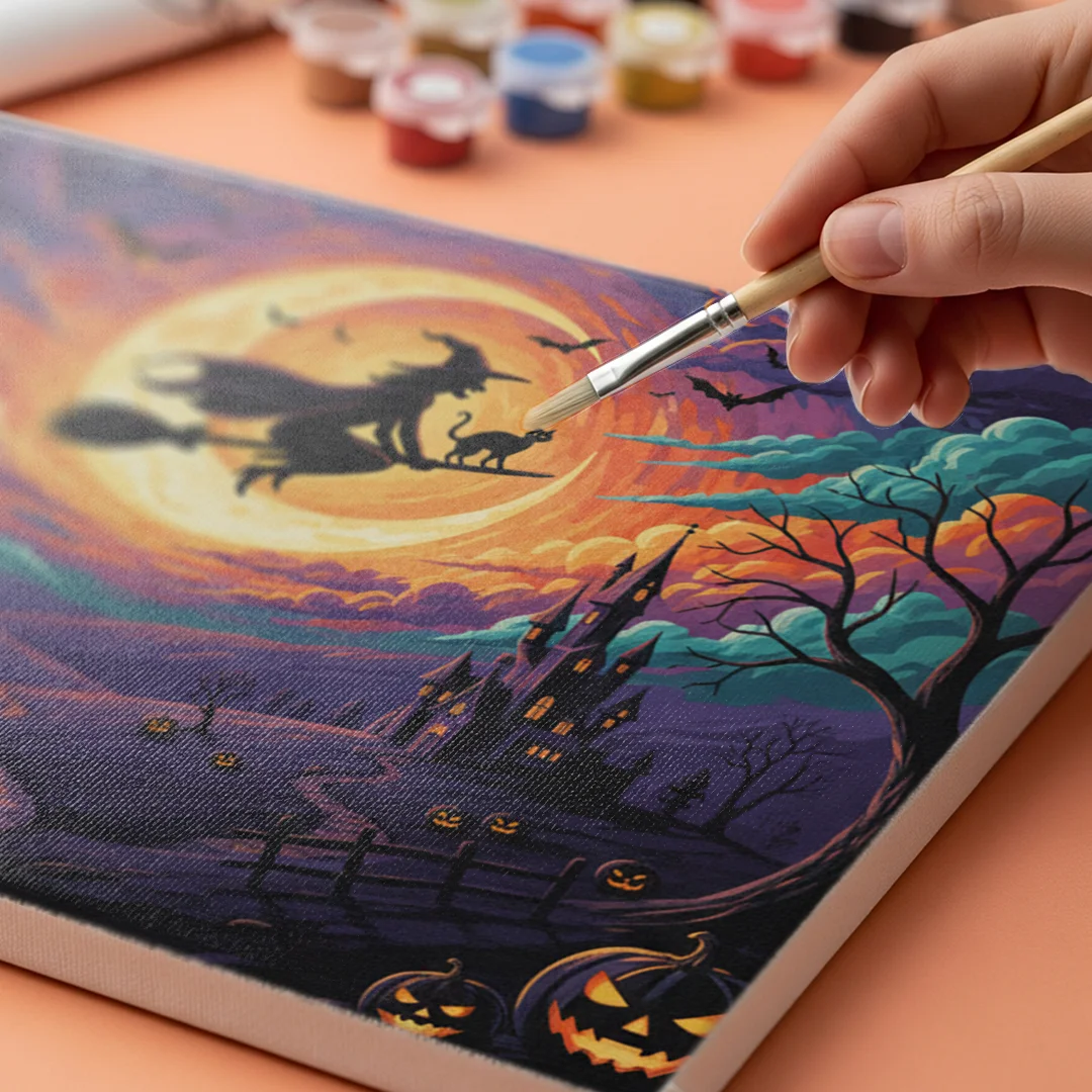 ¿Busca una salida para toda su creatividad, una actividad divertida para toda la familia? Esto es posible con el brillante, completo y profesional paquete de Pintar por Números – El vuelo de la bruja. Para que puedas crear los más bellos cuadros en casa. El lienzo transparente de alta calidad le permite crear una obra de arte impresionante en poco tiempo. Deje que su interior brille con sus propias creaciones. Pintar por números es el pasatiempo perfecto para ti solo o para toda la familia.