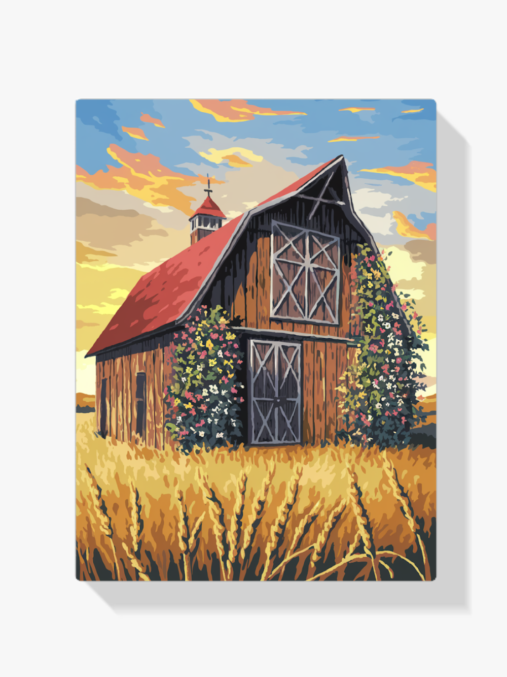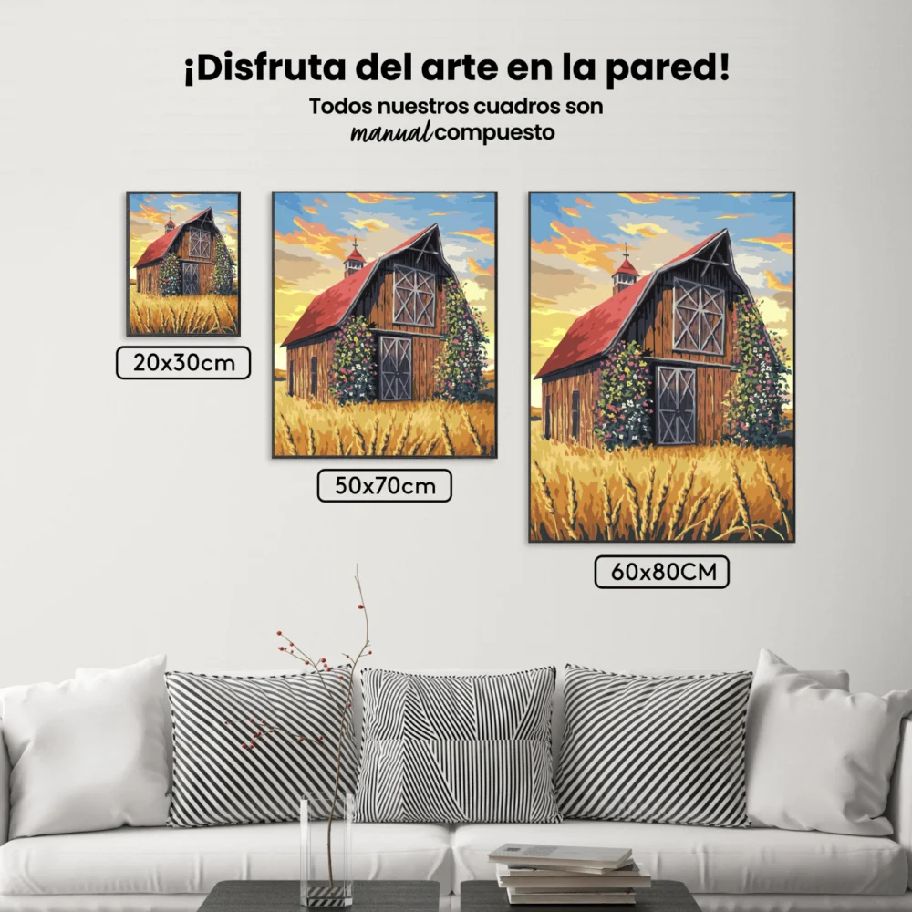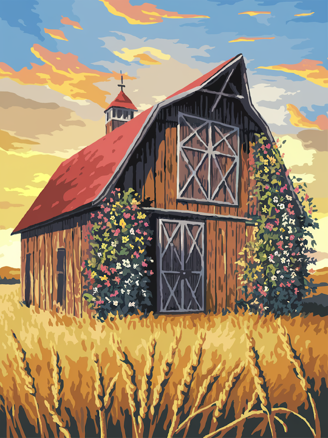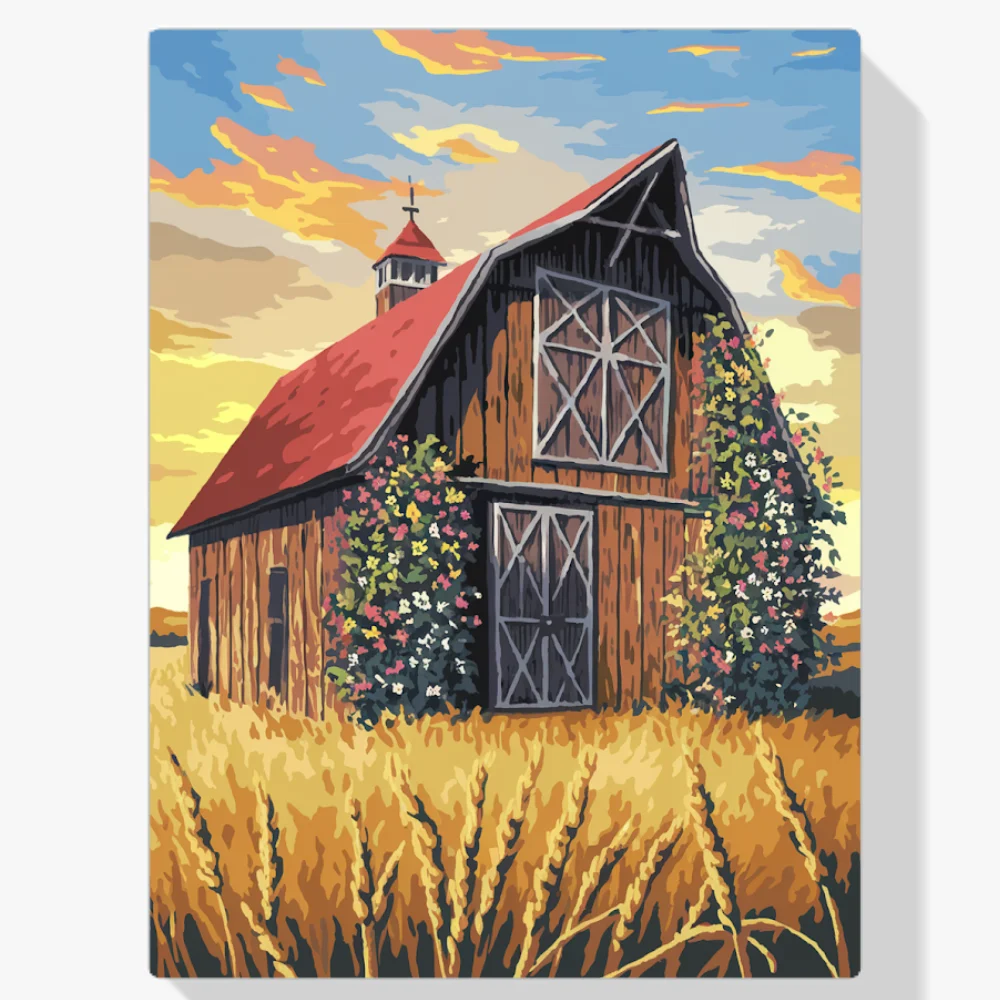 - Pintar por Números – Granero rústico con tejado rojo en un campo dorado
