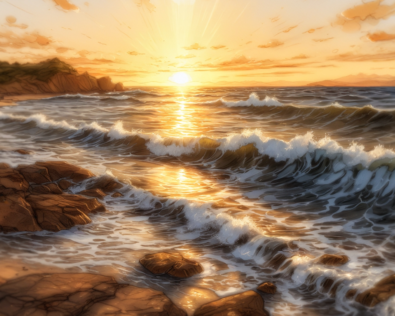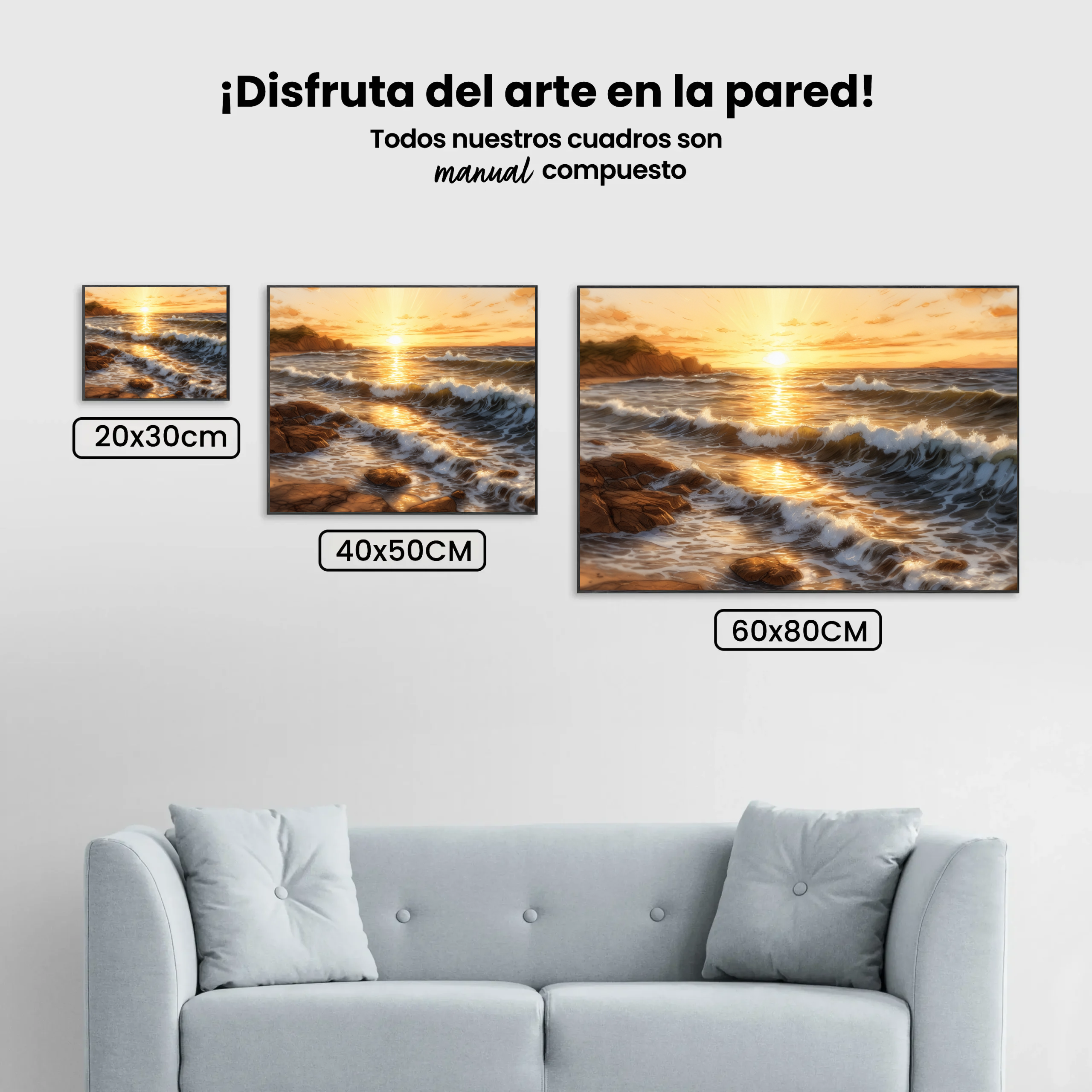 ¿Busca una salida para toda su creatividad, una actividad divertida para toda la familia? Esto es posible con el brillante, completo y profesional paquete de Pintar por Números – Olas doradas al atardecer. Para que puedas crear los más bellos cuadros en casa. El lienzo transparente de alta calidad le permite crear una obra de arte impresionante en poco tiempo. Deje que su interior brille con sus propias creaciones. Pintar por números es el pasatiempo perfecto para ti solo o para toda la familia.