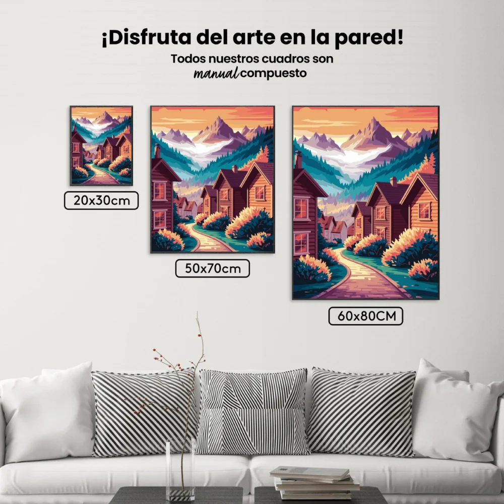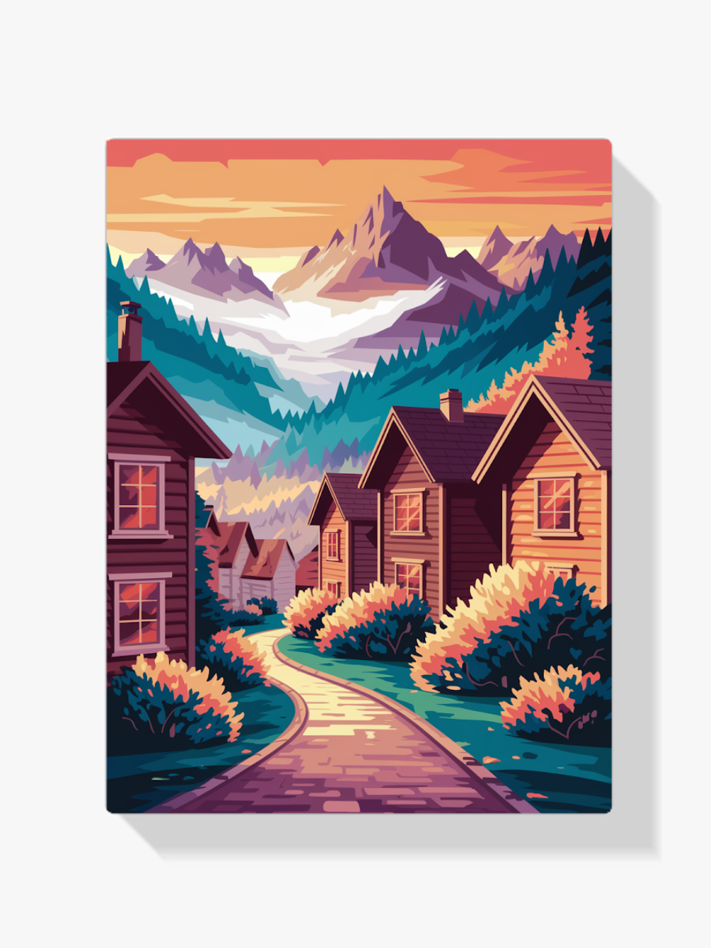 - Pintar por Números – Pueblo de montaña al amanecer con picos neblinosos V1