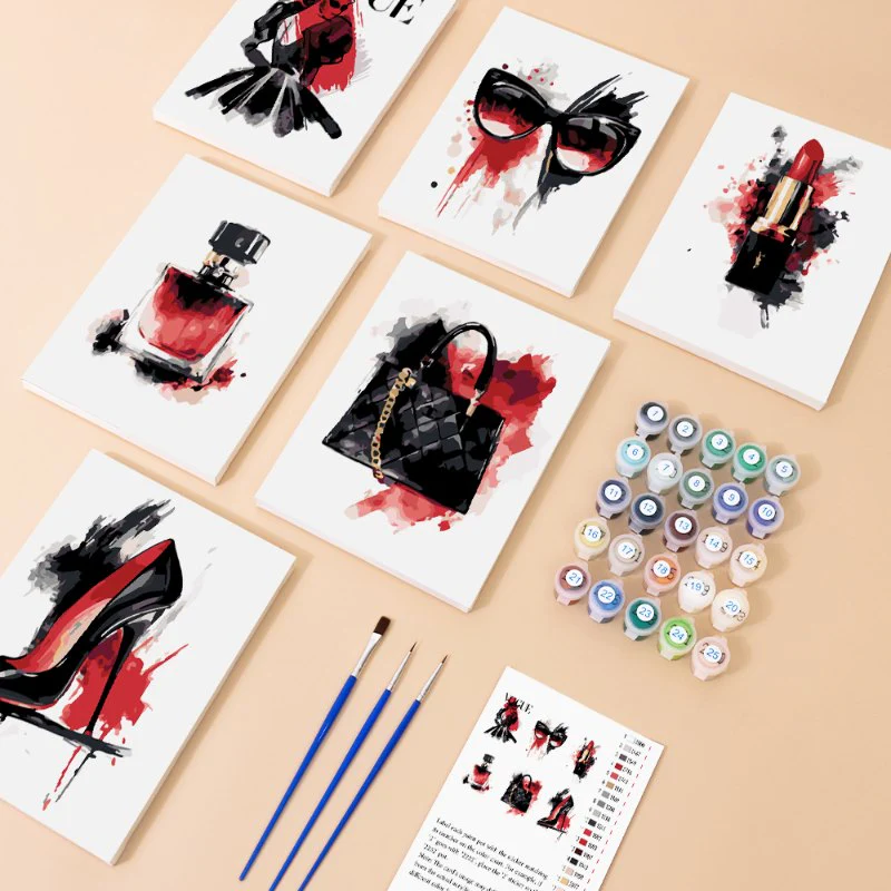 ¡Dale un toque de estilo a tu hogar con nuestro set de 6 mini pinturas | Conjunto glamour rojo y negro! Este colorido set incluye 6 pinturas vibrantes, cada una con un diseño único. Deja volar tu creatividad y disfruta de un viaje artístico lleno de diversión. El Set Mini Pinturas por Números es perfecto como regalo o como colección decorativa y sin duda añadirá un ambiente alegre e inspirador a cualquier espacio. Transforma tu hogar con estos diseños refrescantes.